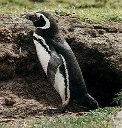 King Penguin, South Georgia. Length: 94cm, Stands 76cm ![]() Has very distinct bright golden-orange auricular patches on sides of head which extend down as narrow band of colours across throat to form a deep orange and golden-yellow patch on silver-white upper breast. Nape and shoulders a clear steel-blue, blending to black-grey on back. Leading edges of auricular patches and head a deeper black. Immature birds similar, but not clear, deep colour of adults. Young over ten days old are covered with dense, deep brown down with purplish tints. Fully grown young often appear much larger than attending adults. Unique breeding cycle: incubation of one egg lasts for 54-55 days and chick rearing 11-12 months. As the complete breeding cycle takes about 14 Months (South Georgia), a pair will generally only breed twice in three years. Diet includes fish and squid, caught by deep dives during daylight hours. |